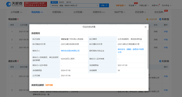 三言财经7月7日消息,天眼查App显示,7月6日,神州优车(福建)信息技术有限公司新增一条股权冻结信息,被执行人为神州优车股份有限公司,股权被执行的企业为神州优车(福建)信息技术有限公司,执行法院为福建省厦门市中级人民法院,股权数额约52.44亿人民币,执行通知文书号(2021)闽02工商控第581号。