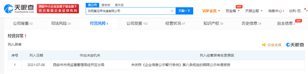 三言财经7月7日消息,天眼查App显示,7月6日,陕西黄马甲快递有限公司因未依照《企业信息公示暂行条例》第八条规定的期限公示年度报告,被西安市市场监督管理局经开区分局列入经营异常。