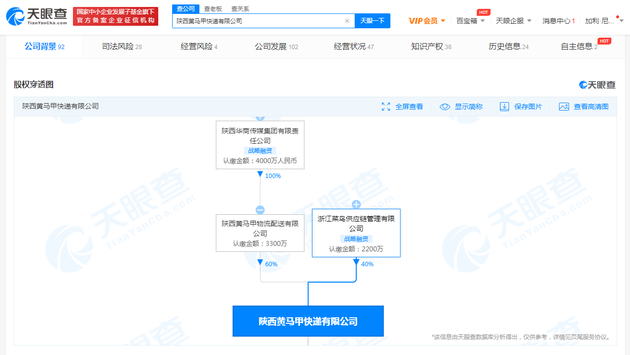 股权穿透图显示,该公司由华商传媒旗下陕西黄马甲物流配送有限公司和浙江菜鸟供应链管理有限公司共同持股,后者所持股份比例占40%。