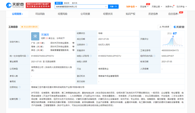 三言财经7月7日消息,天眼查App显示,近日,海南誉鹰管理服务有限公司成立,注册资本500万人民币,法定代表人宋澜涛。经营范围含住宿服务;餐饮服务;汽车租赁;电子产品销售等。