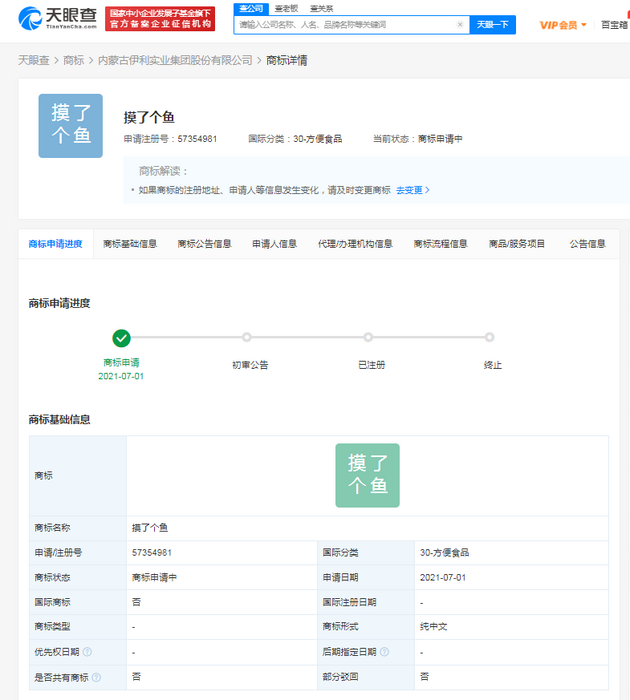 三言财经7月7日消息,天眼查App显示,近日,内蒙古伊利实业集团股份有限公司申请注册“摸了个鱼”商标,国际分类为方便食品,商标状态为商标申请中。