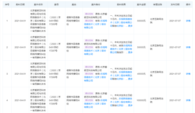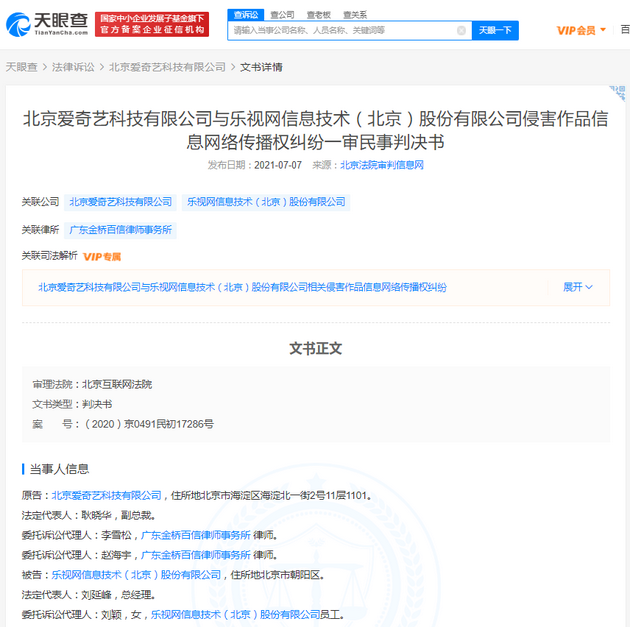 三言财经7月7日消息,天眼查App显示,今日,北京爱奇艺科技有限公司关联多条法律文书公开,案由均为侵害作品信息网络传播权,案号(2020)京0491民初17286号、(2020)京0491民初17287号等,审理法院均为北京互联网法院。