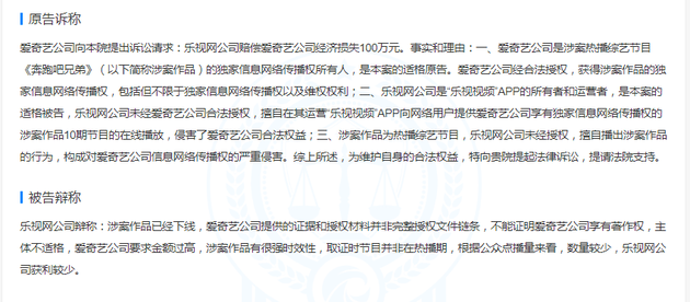 判决书显示,原告爱奇艺公司诉称,被告乐视网公司未经原告合法授权,擅自在其运营“乐视视频”APP向网络用户提供《奔跑吧兄弟》《明星到我家》等节目的在线播放,侵害了爱奇艺公司合法权益。