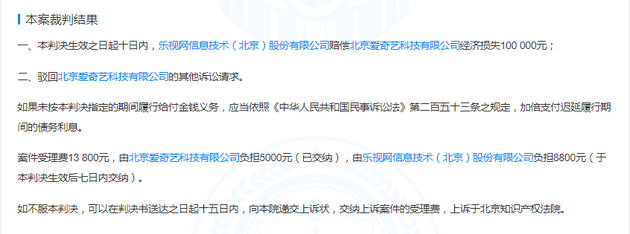 最终裁判结果为,本判决生效之日起十日内,乐视网信息技术(北京)股份有限公司赔偿北京爱奇艺科技有限公司经济损失共计24万元。