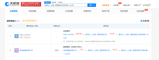 股东信息显示,该公司由爱马仕(上海)贸易有限公司全资持股。