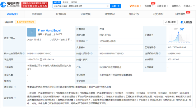 三言财经7月8日消息,天眼查App显示,7月5日,大众汽车(安徽)零部件有限公司成立,注册资本10亿人民币,法定代表人为Frank Horst Engel,经营范围含汽车零部件研发;汽车零配件零售;新能源汽车废旧动力蓄电池回收等。
