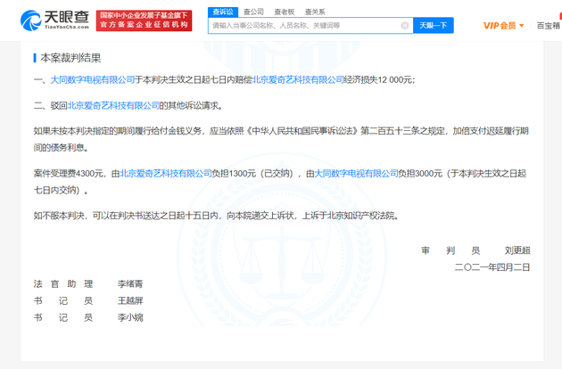 裁判结果为大同数字电视有限公司于本判决生效之日起七日内赔偿北京爱奇艺科技有限公司经济损失12000元。