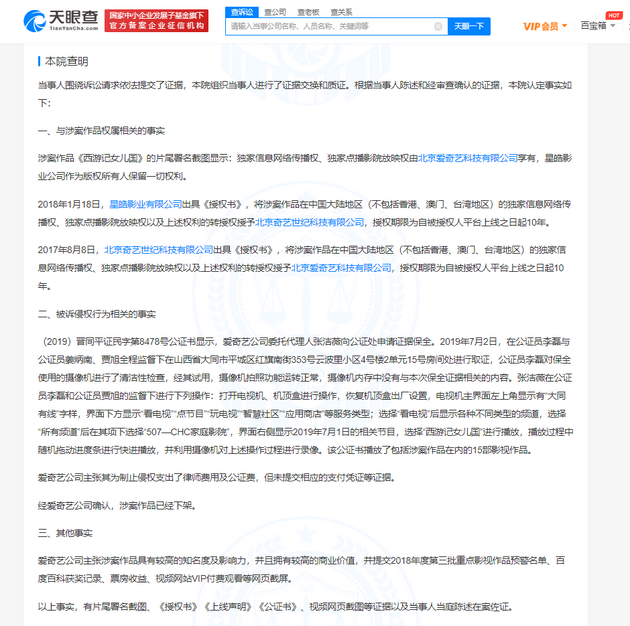 判决书显示,原告诉爱奇艺公司称:涉案作品《西游记女儿国》的著作权人星皓影业有限公司将涉案作品在中国大陆地区的独家信息网络传播权以及转授权授予了北京奇艺世纪科技有限公司。而大同数字公司未经爱奇艺公司授权,在其运营的“大同有线”电视端平台“频道”板块,通过信息网络向公众提供涉案作品的在线播放服务。大同数字公司的行为已经构成侵权并给爱奇艺公司造成巨大的损失等。