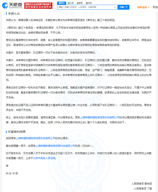 判决书显示,原告诉称:诉争商标是原告旗下电竞战队BLG的吉祥物,原告已对诉争商标进行使用,并利用自身影响力进行宣传推广,使诉争商标与原告形成了对应关系,因此请求法院撤销该图形商标驳回复审决定。