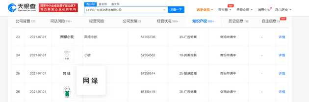 三言财经 7月12日消息,天眼查App显示,近日,OPPO广东移动通信有限公司申请“网绿”“网绿小O”“网绿小欧”等商标,国际分类为服装鞋帽、广告销售等,当前商标状态均为“商标申请中”。
