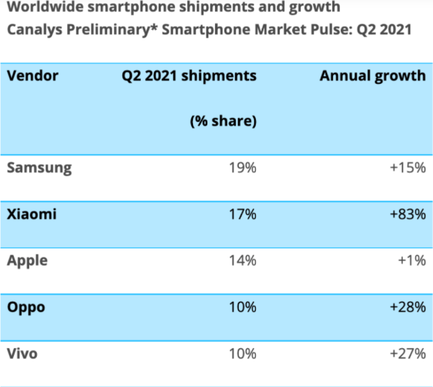 三言财经 7月16日消息,今日Canalys发布了第二季度全球智能手机市场份额的报告。报告显示,三星占总出货量的19%,排名第一。值得注意是,小米有史以来首次位居第二,市场占有率达到17%。苹果以14%的份额位居第三,而vivo和OPPO跻身前五名。