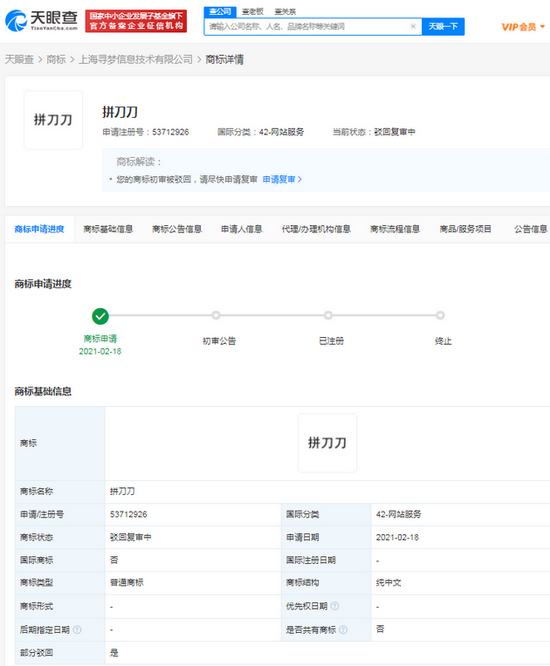 三言财经 7月30日消息,天眼查App显示,近日,拼多多关联公司上海寻梦信息技术有限公司申请注册的多个“拼刀刀”商标被驳回,此类商标国际分类包括网站服务、社会服务、通讯服务等,商标首次注册申请日期为2021年2月。据悉,“拼刀刀”为热播剧《赘婿》中的梗。