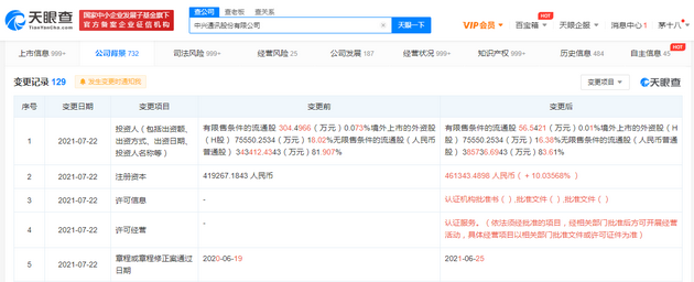 三言财经 7月30日消息,天眼查App显示,近日,中兴通讯股份有限公司发生工商变更,注册资本约由41.93亿人民币增至46.13亿人民币,增幅超10%。