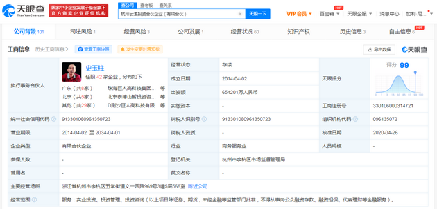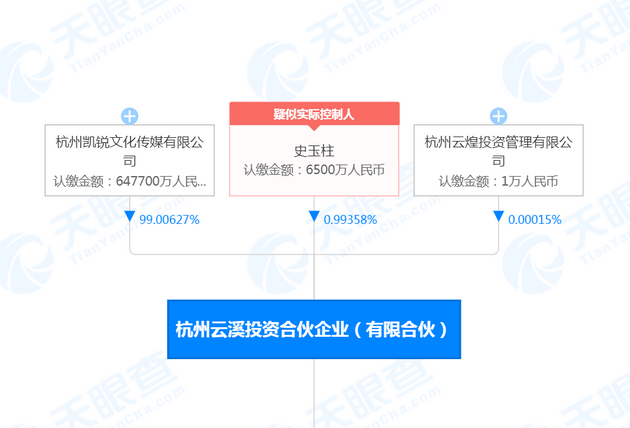 合伙人信息显示,该企业合伙人包括史玉柱、杭州云煌投资管理有限公司、杭州凯锐文化传媒有限公司。