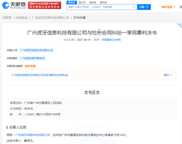 三言财经 8月24日消息,天眼查App显示,近日,广州虎牙信息科技有限公司与杜某合同纠纷一审民事判决书公开。