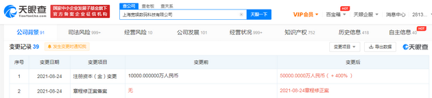 三言财经8月25日消息,天眼查App显示,近日,上海宽娱数码科技有限公司注册资本由1亿人民币增至5亿人民币,增幅400%。