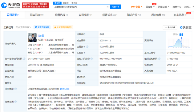上海宽娱数码科技有限公司成立于2005年8月,法定代表人为陈睿,经营范围含信息网络传播视听节目;网络文化经营;广播电视节目制作经营;营业性演出等。