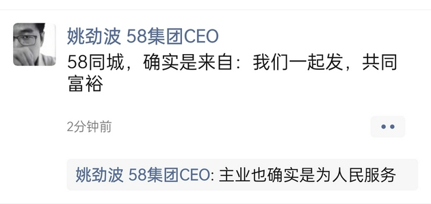 三言财经8月31日消息,58同城CEO姚劲波今日在朋友圈发文表示,58同城名字来自“我们一起发”,寓意是共同富裕,主业也是为人民服务。
