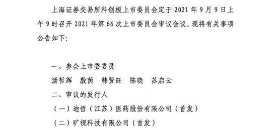 三言财经9月2日消息,上交所发布公告称,科创板上市委定于9月9日召开审议会议,审核旷视科技有限公司、迪哲(江苏)医药股份有限公司的首发事项。