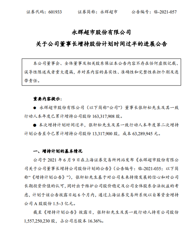 三言财经9月8日消息,永辉超市今日发布公告称,公司董事长张轩松及其一致行动人已于2021年6月9日至2021年9月8日期间增持公司股份1331.8万股,成本6329万元,占公司总股本0.14%。