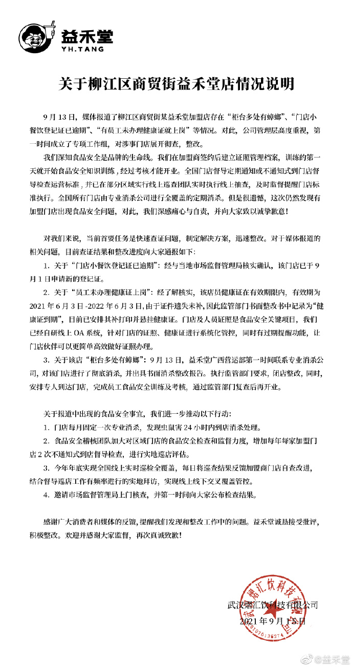 对此,益禾堂发布情况说明表示,公司管理层高度重视,第一时间成立了专项工作组,对涉事门店展开彻查、整改。