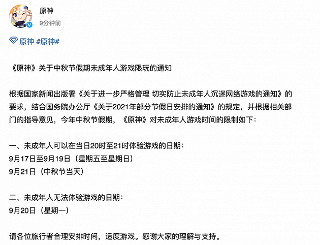 三言财经 9月16日消息,今日原神发布中秋节假期未成年人游戏限玩通知,今年中秋节假期,《原神》对未成年人游戏时间的限制如下:9月17日到21日,未成年人可以在当日20时至21时体验游戏。