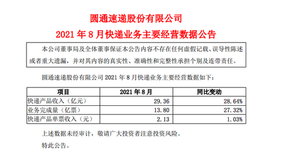 三言财经9月17日消息,圆通速递发布公告称,8月实现快递产品收入29.36亿元,同比增长28.64%;业务完成量13.8亿票,同比增长27.32%。