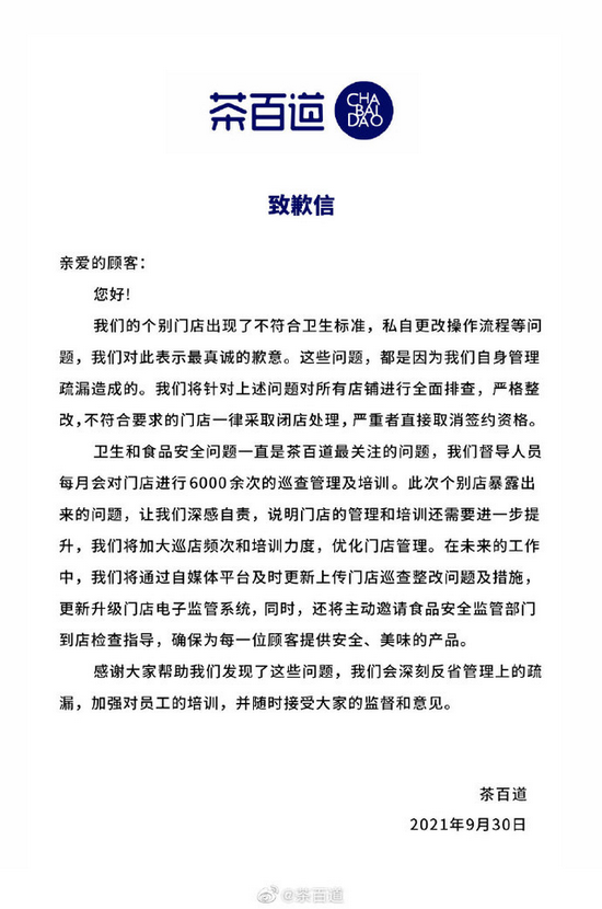 今日凌晨,茶百道发布致歉声明称,个别门店出现了不符合卫生标准,私自更改操作流程等问题。茶百道将针对上述问题对所有店铺进行全面排查,严格整改,不符合要求的门店一律采取闭店处理,严重者直接取消签约资格。