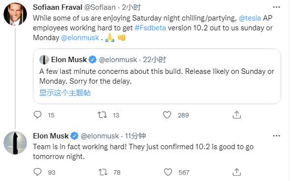 三言财经 10月10日消息,特斯拉 CEO 埃隆・马斯克今日回复网友时表示:工作团队刚刚确认 FSD beta10.2 版本将在明晚(北京时间后天凌晨)上线。