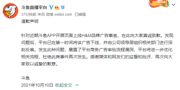 今日,斗鱼发布道歉声明称,平台已在第一时间将该广告下线,并由公司领导层组织相关部门进行深刻反省。发生此种问题,暴露了平台商务广告审批流程漏洞,平台将进一步优化相关流程,杜绝此类事件再次发生。感谢媒体和网友们的监督和批评。