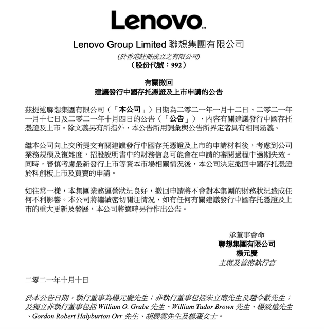 三言财经 10月10日消息,今日联想集团发布公告称,在提交上市申请材料后,考虑到公司业务规模及复杂程度,招股书中的财务信息可能会在申请的审阅过程中过期失效。同时,谨慎考虑最新发行上市等资本市场相关情况后,决定撤回上市申请。