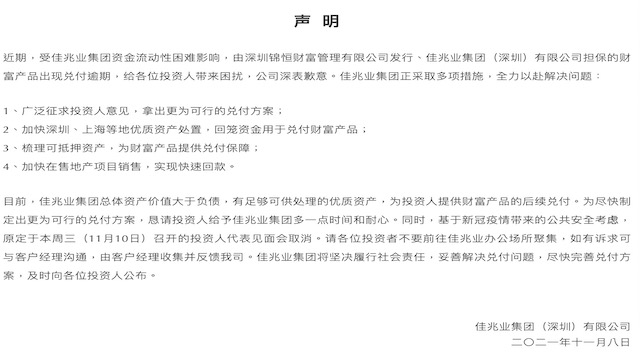 三言财经 11月9日消息,昨日佳兆业就此前爆发的财富产品兑付逾期发表声明,称“集团正采取多项措施,全力以赴解决问题。”同时,公司原本计划于周三举行的投资者代表见面会暂时取消。