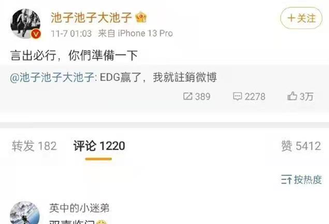 三言财经 11月10日消息,S11总决赛前脱口秀演员池子曾发布微博立下flag:EDG赢了,我就注销微博!