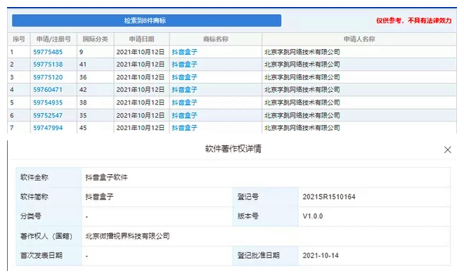事实上,早在今年10月,抖音就已经陆续进行“抖音盒子”的相关软著和商标申请。另外,抖音关联公司还备案了抖音盒子官网(www.boxdouyin.com)。