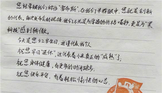 三言财经 12月16日消息,今天晚间,雷军在其微博发文称,自己收到一份特别的生日礼物:来自武汉米粉同城会7位米粉的礼物,笔记本上写了长长的生日祝福信。