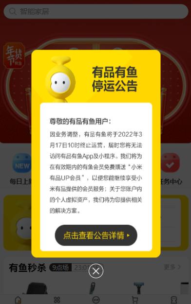 三言财经 1月17日消息,小米有品有鱼宣布,因业务调整,有品有鱼将于2022年3月17日10时终止运营,届时用户将无法访问有品有鱼App及小程序。