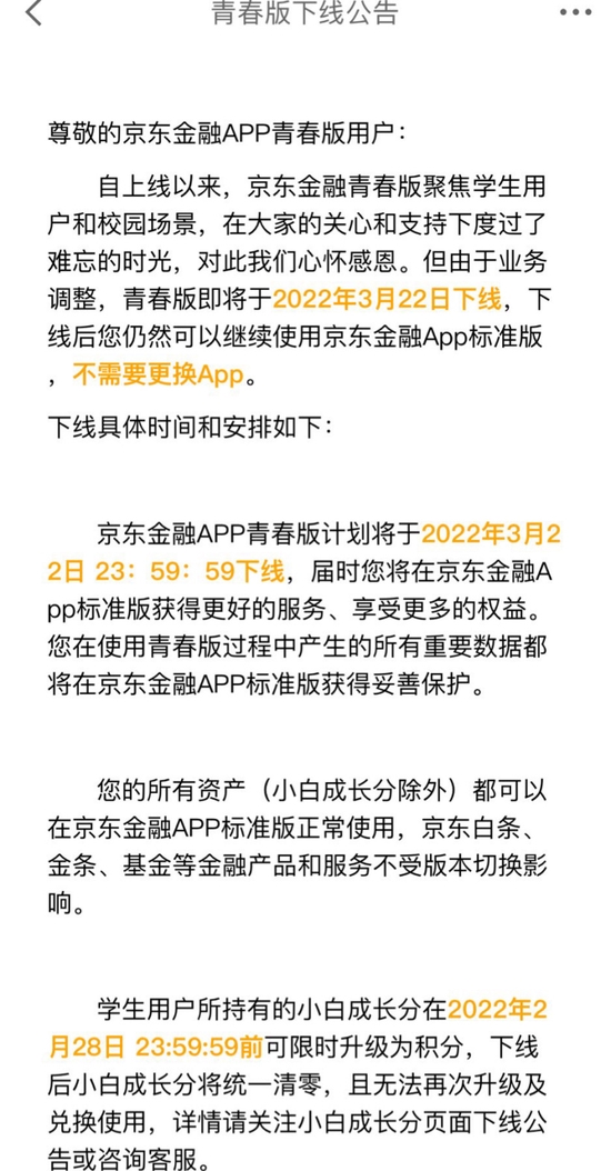 三言财经 2月16日消息,近日,京东金融发布公告称,由于业务调整,京东金融App青春版将于3月22日下线,下线后用户仍可继续使用京东金融App标准版,不需要更换App。学生用户所持有的小白成长分在2022年2月28日23:59:59前可限时升级为积分,下线后小白成长分将统一清零,且无法再次升级及兑换使用。