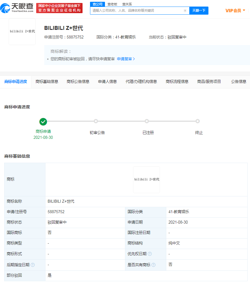 三言财经 2月18日消息,天眼查信息显示,近期,B站关联公司上海幻电信息科技有限公司申请的多个“Z+ 世代”“BILIBILI Z+世代”“GENERATION Z+”“GEN Z+”商标流程变更为“驳回通知发文”“驳回复审”,国际分类包括教育娱乐、广告销售、食品等。此前,该公司多个Z+世代相关商标已成功注册。