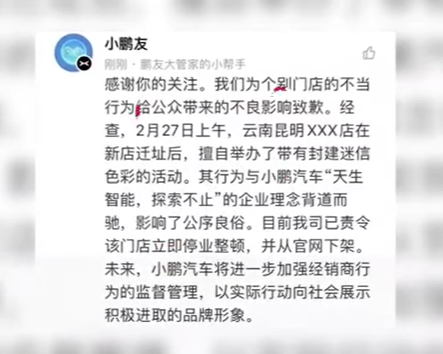 2月27日,小鹏汽车发布公告称,为个别门店不当行为给公众带来的不良影响致歉。小鹏表示,经查,2月27 日上午,云南昆明XXX店在新店迁址后,擅自举办了带有封建迷信色彩的活动。其行为与小鹏汽车“天生智能,探索不止”的企业理念背道而驰,影响了公序良俗。目前小鹏汽车已责令该门店立即停业整顿,并从官网下架。未来,小鹏汽车将进一步加强经销商行为的监督管理,以实际行动向社会展示积极进取的品牌形象。