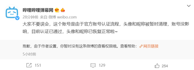 对此,哔哩哔哩弹幕网回应称,这个账号是由于官方账号认证流程所致,头像和昵称被暂时清理,账号没影响,目前认证已通过,头像和昵称已恢复正常。