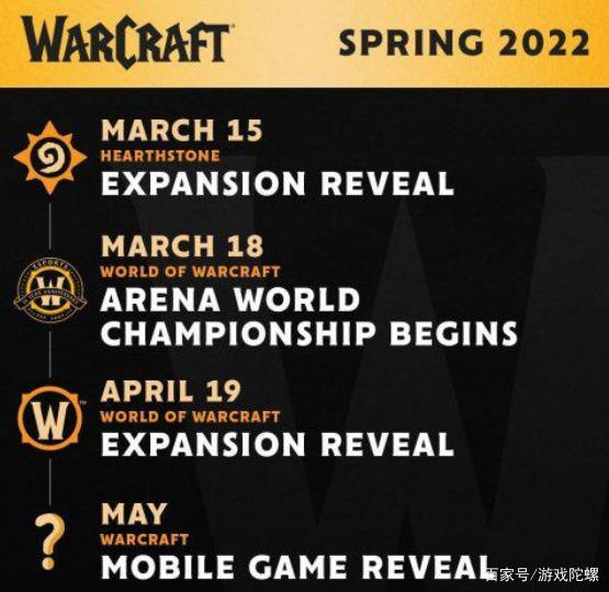 根据计划表显示,暴雪将于3月15日公开《炉石传说》新资料片;3月18日开启电子竞技;4月19日公布《魔兽世界》新资料片,最后在5月份发布全新的《魔兽》手游作品的消息。