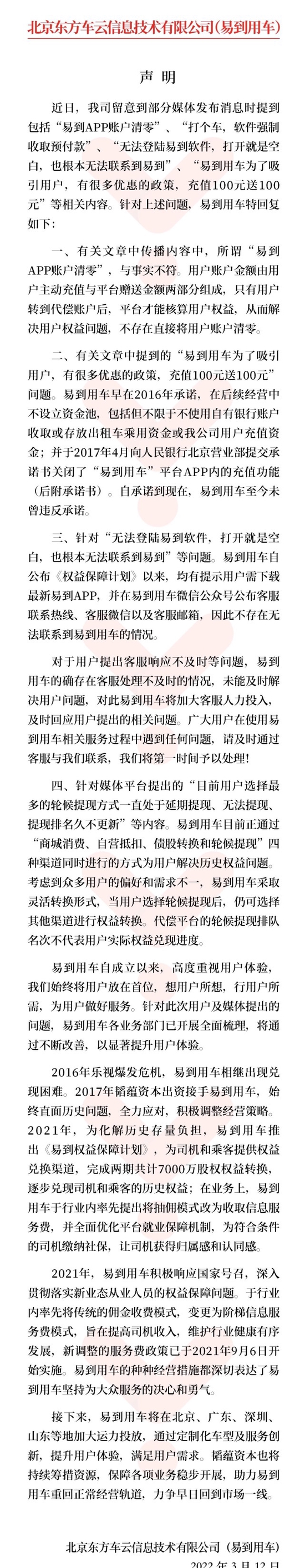 对此,易到用车今日发布声明称,所谓“易到App账户清零”,与事实不符,“用户账户金额由用户主动充值与平台赠送金额两部分组成,只有用户转到代偿账户后,平台才能核算用户权益,从而解决用户权益问题,不存在直接将用户账户清零。”