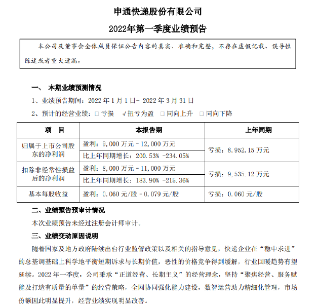三言财经4月14日消息,申通快递今日发布2022年第一季度业绩预告,预计第一季度净利润9000万元-1.2亿元,上年同期亏损8952.15万元。
