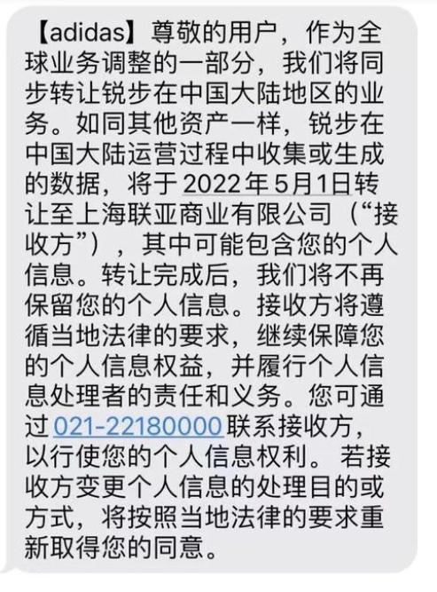 短信显示:“作为全球业务调整的一部分,我们将同步转让锐步在中国大陆地区的业务。如同其他资产一样,锐步在中国大陆运营过程中收集或生成的数据,将于2022年5月1日转让至上海联亚商业有限公司(接收方),其中可能包含您的个人信息。转让完成后,我们将不再保留您的个人信息。接收方将遵循当地法律的要求,继续保障您的个人信息权益,并履行个人信息处理者的责任和义务。”