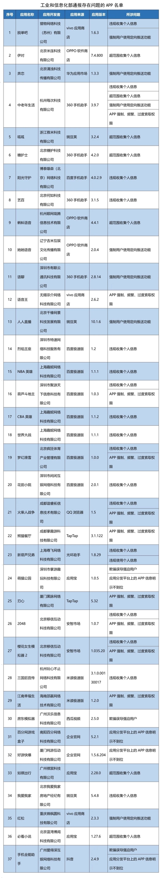 三言财经 4月20日消息,据工信部网站消息,依据《个人信息保护法》《网络安全法》《电信条例》《电信和互联网用户个人信息保护规定》等法律法规,工信部近期组织第三方检测机构对移动互联网应用程序(APP)进行检查。截至目前,尚有37款APP未完成整改。其中,人人直播、我爱我家等在列。