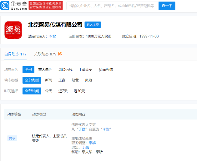 三言财经 4月26日消息,企查查APP显示,4月25日,北京网易传媒有限公司发生工商变更,丁磊卸任法定代表人、总经理、董事职务,由网易传媒CEO李黎担任法定代表人并从监事调整为经理、执行董事。