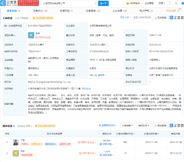 该公司成立于1999年11月,注册资本1000万元人民币,经营范围包括组织文化交流活动(演出除外)、软件开发、广播电视节目制作等,丁磊为大股东,持股比例99%。
