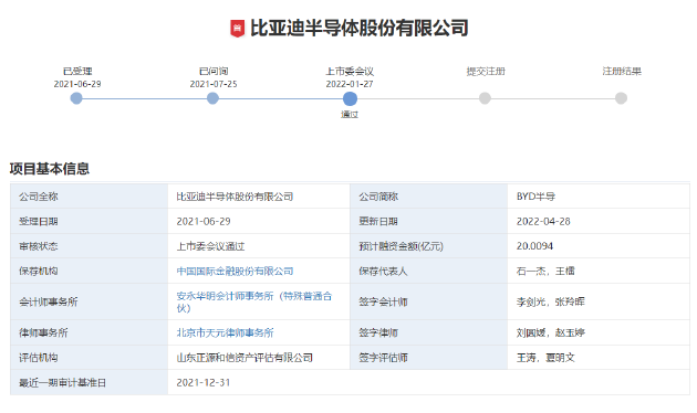 三言财经 4月28日消息,创业板发行上市审核信息公开网站显示,比亚迪半导体股份有限公司审核状态变更为上市委会议通过。