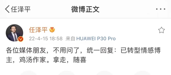 4月15日,任泽平发文称,自己已转型情感博主,鸡汤作家。
