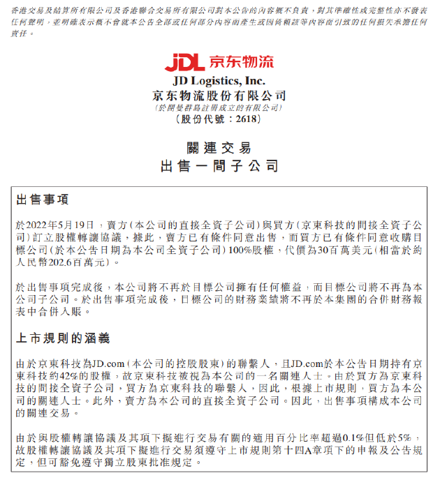 三言财经 5月20日消息,京东物流发布公告称,公司的直接全资子公司(卖方)与京东科技的间接全资子公司订立股权转让协议(买方);据此,卖方已有条件同意出售,而买方已有条件同意收购京东国际融资租赁有限公司(于公告日期为公司全资子公司)100%股权,代价为3000万美元(相当于约人民币2.03亿元)。